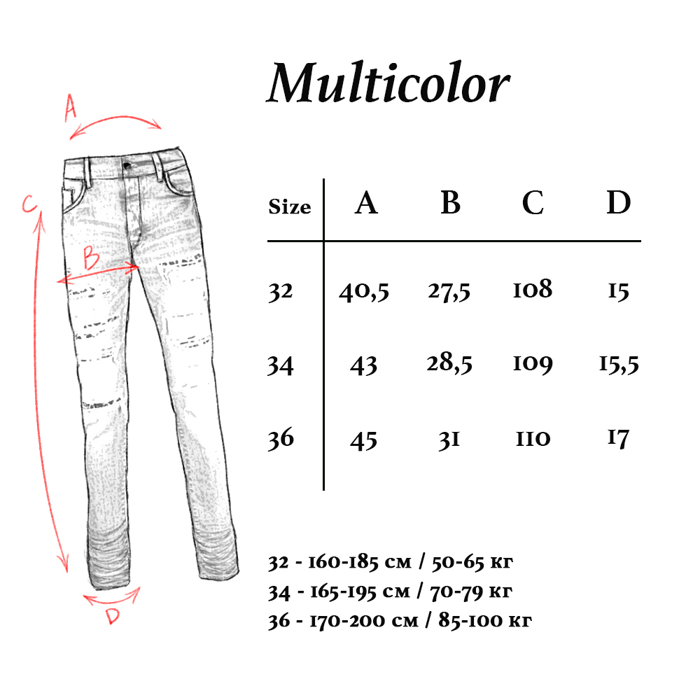 - Рваные джинсы цвета черного цвета и вставками мультиколор, так же на джинсах присутствует эффект потертости и выгорания